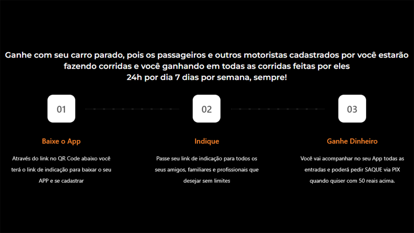 Ganhe com seu carro parado, pois os passageiros e outros motoristas cadastrados por você estarão fazendo corridas e você ganhando em todas as corridas feitas por eles.